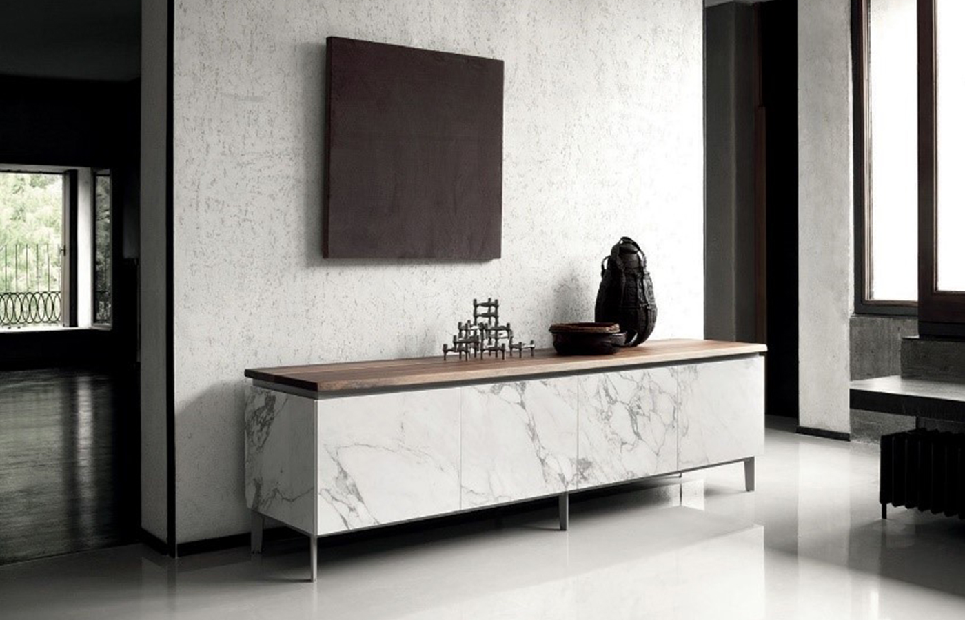 Komoda dostupna sa vratima, fiokama, pregradama, unutrašnje police od transparentnog stakla. Gornji, prednji i bočni paneli u punom drvetu, staklu, granitnoj keramici ili mermeru. Visina 69cm, dubina 55cm, širina od 124 do 244cm.
